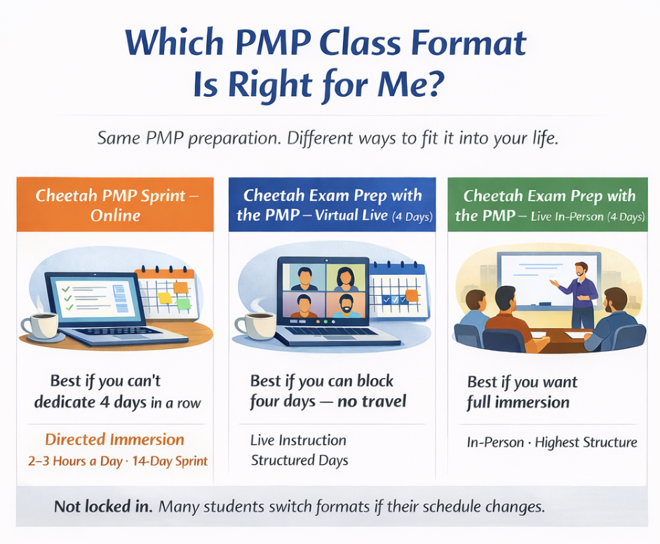 - Cheetah PMP Sprint 4 week online – you follow a structured immersion program with Cheetah Exam Prep daily activities. Feedback is based on your participation. The program is designed to be done independently. Your Cheetah PMP Coach tracks your progress and is available to help via email, phone, text, or zoom.