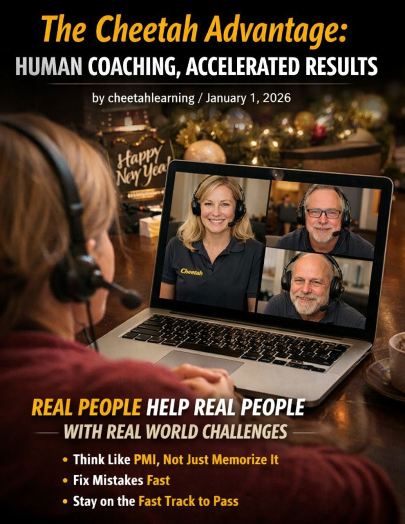 Today, New Year’s Eve, there were three, live Cheetah PMP Coaches responding to one PMP Exam Prep Cheetah student. He had registered yesterday and received a welcome email from the lead instructor for his class. He texted his Cheetah career coach and asked “are you using AI or is this a real person” relating to the welcome email. He had also emailed the lead instructor. While texting the cheetah career coach, he said, “well I guess you are real people – I’ve now heard from three live Cheetah PMP Coaches.” He then texted “thanks as I was trying to calibrate my expectations.”